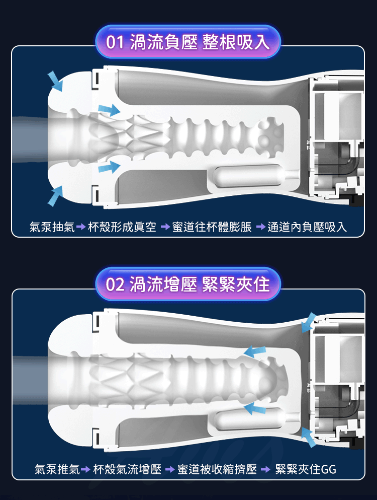 內部 TPE 夾吸通道搭配 9 頻震動與 9 頻吸吮,從輕柔到爆衝,變化豐富、緊實有感。